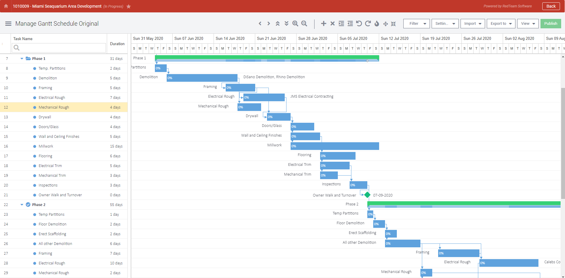 Gantt Schedules in RedTeam are used to track the progress of various tasks within a Project. You can import these Schedules from another RedTeam Project or from a MS Project file. Tasks can be assigned durations, start and end dates, and be linked to other tasks. You can Publish these Schedules directly to the Schedule Updates to share the file in your Project’s Online Planroom.