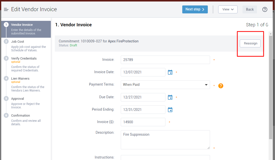 Vendor Invoices can now be reassigned to a different Project, Commitment, or as a Non-Commitment Invoice. In cases where an Invoice was mistakenly entered against the wrong Commitment or perhaps you have a case where you realize the Invoice is for a different Vendor, or any other number of situations that may require you to move a Vendor Invoice, you now have the ability to use the “Reassign” option while the Invoice is in Draft status to quickly move all the information entered for the Invoice in the first step over without deleting and re-entering the Invoice entirely.