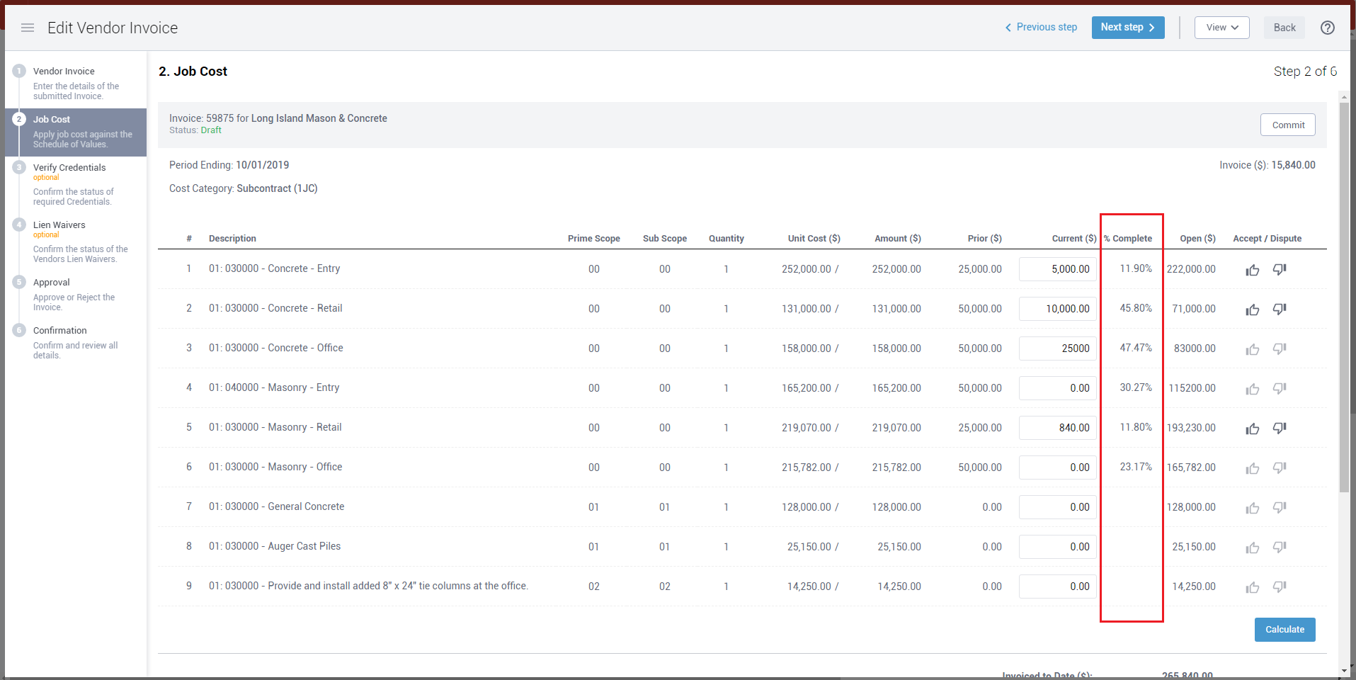 Should you want to know the progress completed for each line item from a Vendor’s Commitment when approving the Vendor’s Invoices against it, you can see this information at a glance.
