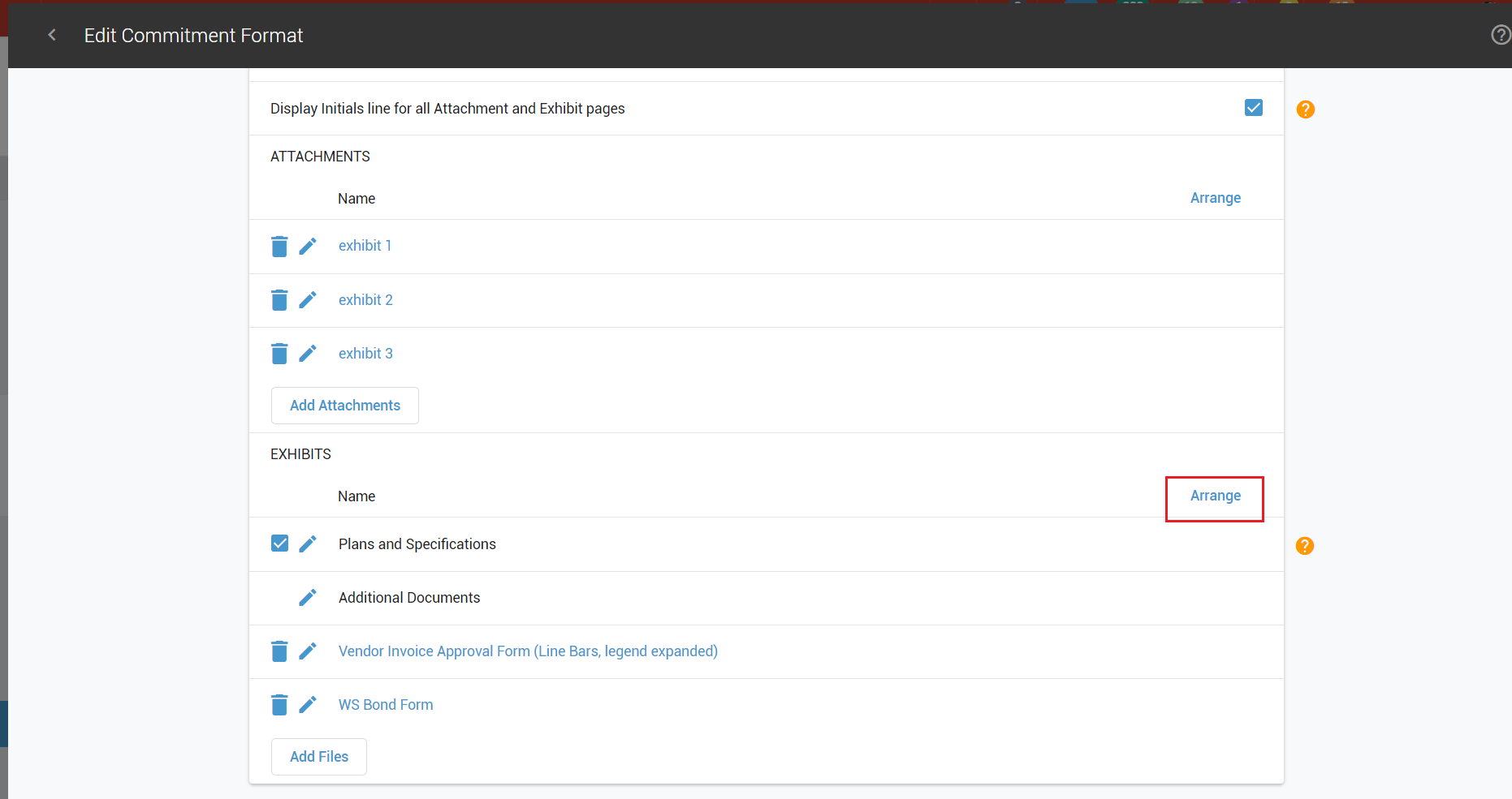 You may now arrange exhibits (inclding Reserved exhibits like Plans & Specifications) on all commitment Forms.