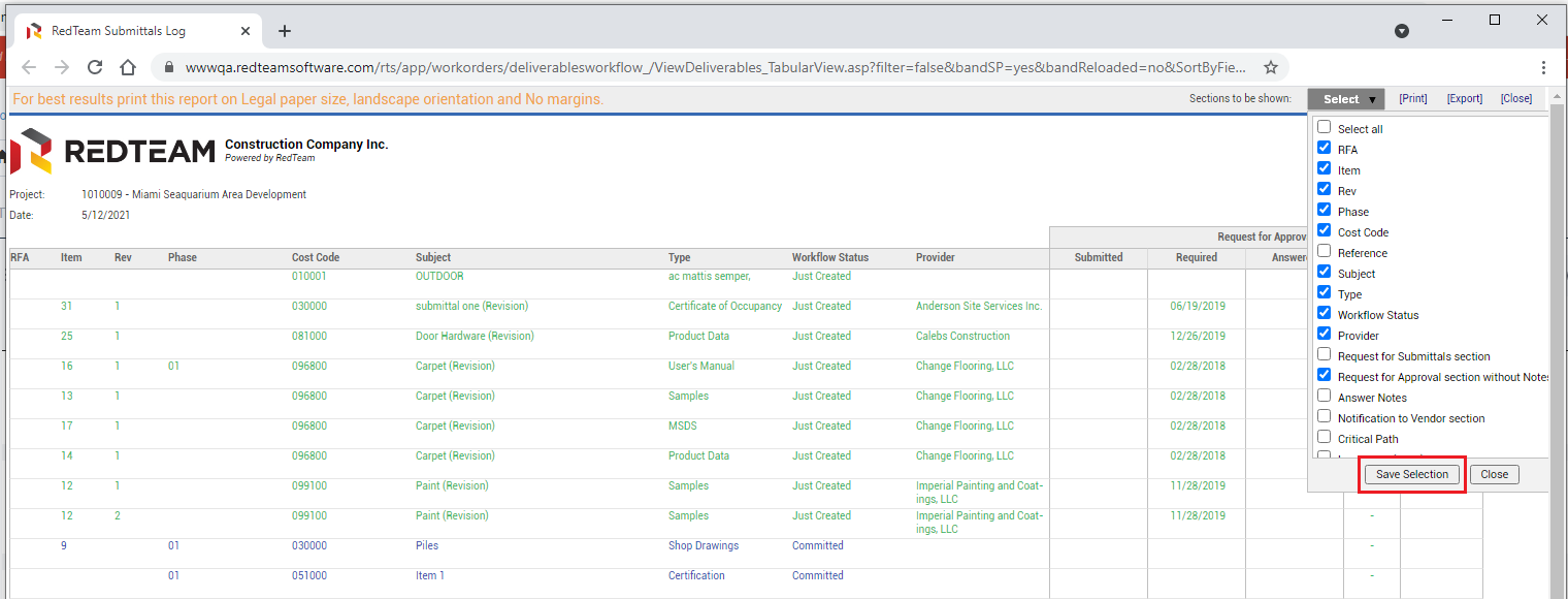 RedTeam users can now save their selection of “Columns to be shown” on the Submittals Log.