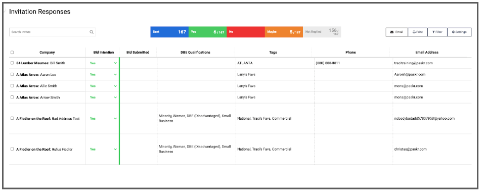 There are no changes to the location of the Invitation Responses, but you now have enhanced options on this page. For instance, try out the filters and select a group of bidders to email a custom message regarding the project.