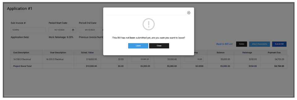 For the GC, this is an improvement meant to alleviate the issue of unintentionally unsubmitted bills by subcontractors. The warning message reminds the sub they need to submit their bill before leaving the page, reducing the number of accidental unsubmitted bills and ensuring you get the bills you need on time without mistakes.