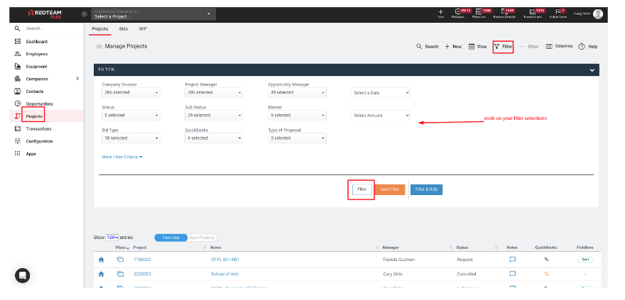 RedTeam Flex has a number of options in the Projects Overview page for columns displayed and the order of the columns displayed based on user preferences, as well as reporting options that are based off of the columns and projects you’ve filtered to view. Run reports specific to a particular project manager or customer or view all active projects on standard reports available within the Projects Overview, the Bids Tab and the WIP tab.