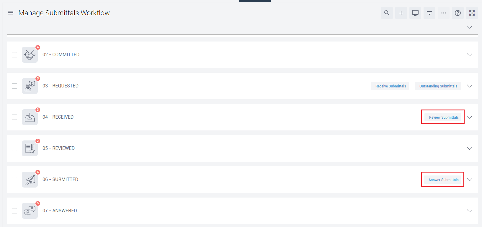 Go to any Project with Submittals and you will see the “Answer” and “Review” buttons in the Workflow so long as you have Submittal Items available and ready to be “Answered” or “Reviewed” by you.