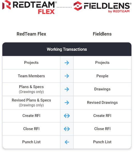 Introducing an integration with two RedTeam products: Flex and Fieldlens. As outlined in the map below, you can see what information this integration will send and receive. If you are a current Flex client and want to learn more about Fieldlens, you can visit our webpage or contact us for a demo and more information.
