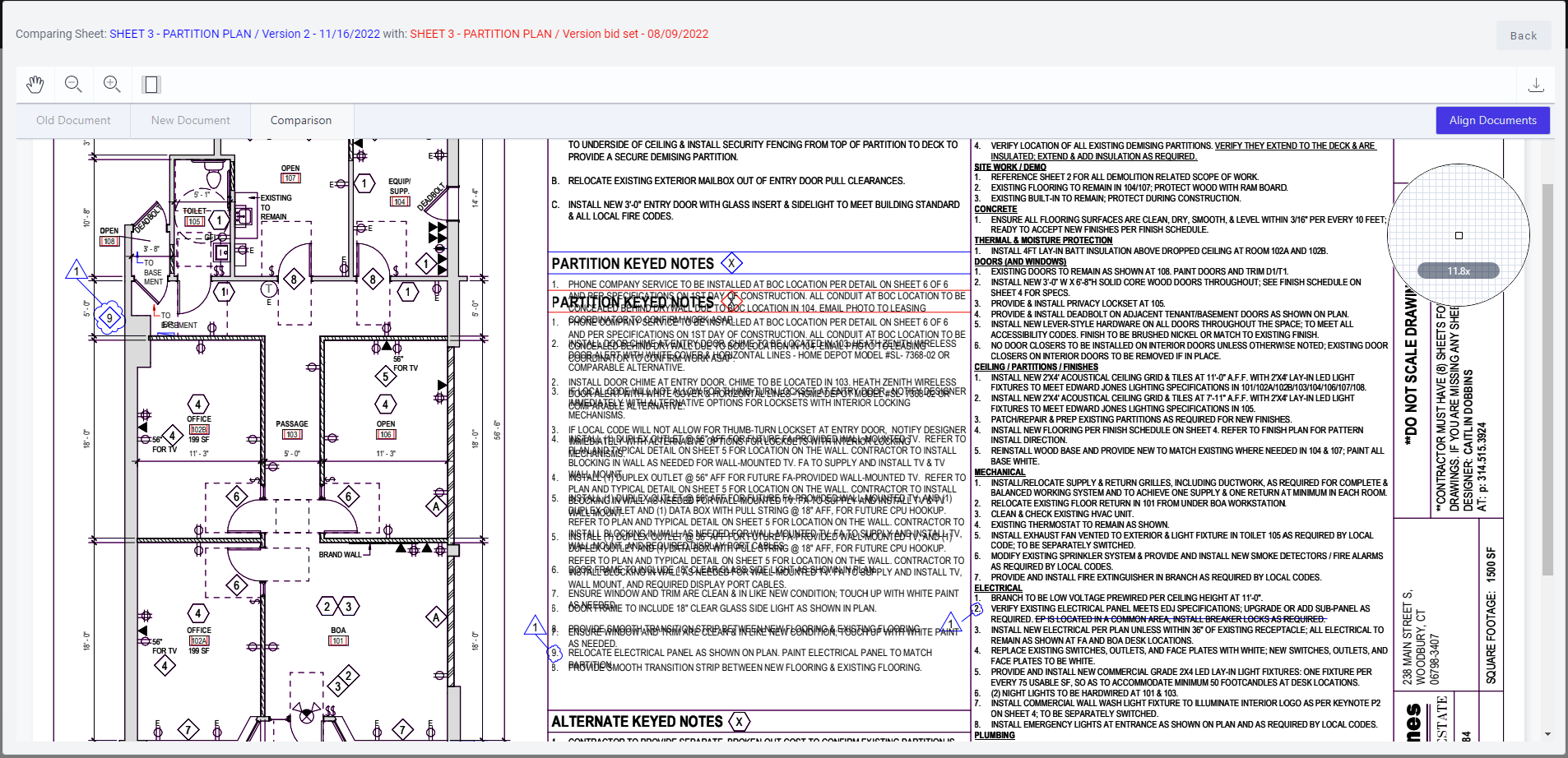 We understand how important it is to track your drawing revisions throughout a Project. Now, in addition to tracking the various versions of a file, you can overlay and compare these versions. In addition to comparing versions of the same file, you have the ability to compare any sheet against another sheet that has been uploaded to the Project.